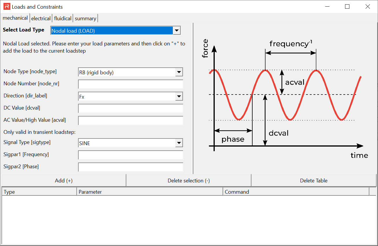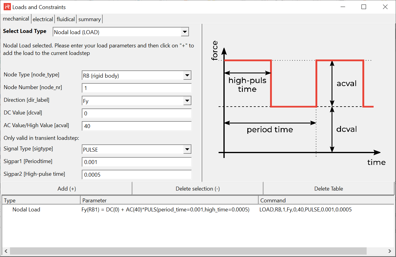 The mechanical domain sub-window covers the LOAD, ACEL, OMEG and DRIV command features. The following figure shows a pulse force signal in y-direction at rigid body #1. Click on the Add (+) button to assign the specified command. Individual commands can be erased by the Delete selection (-) button and all defined mechanical loads and constraints are erased by the Delete Table button.