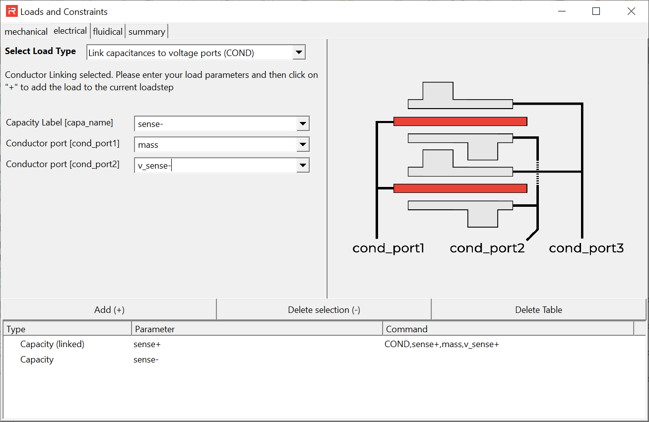 The electrical domain sub-window covers the COND, VSCR and ISCR command features. In a first step, conductor port names are assigned to the comb cells and plate capacitances. Existing comb and plate capacitance labels from the model file appear automatically. The conductor port names are defined by users. Click on Add (+) to link the capacitance to conductor ports.