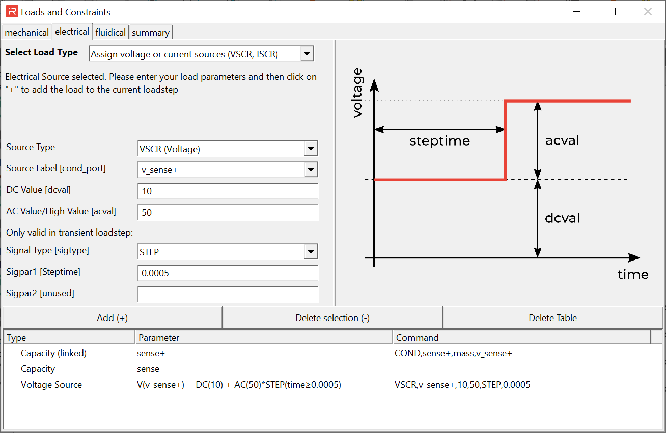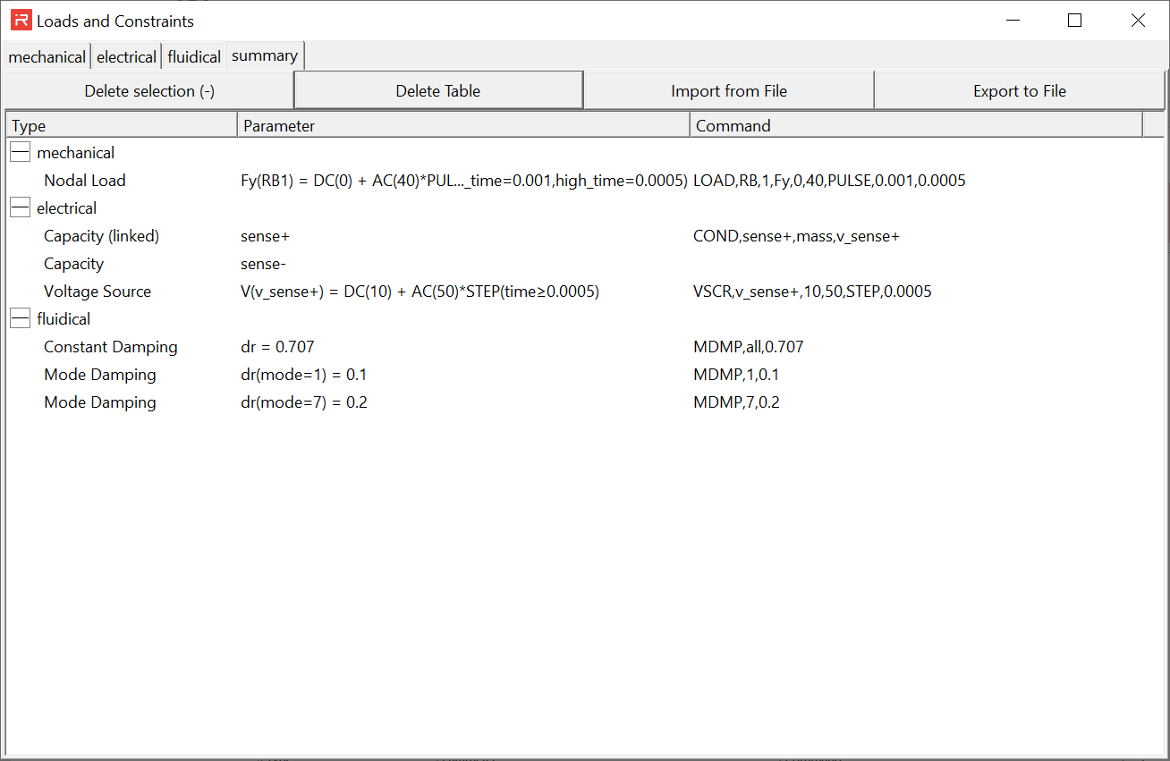 Loads and constraints window consists of sub-windows which are used to assign mechanical, electrical and fluidic loads or constraints. The fourth sub-window provides a summary and can be used to read or write load cases from or to files.