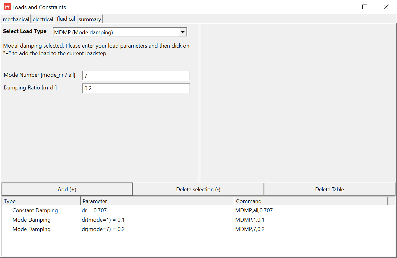 The fluidic domain sub-window covers the CDMP, RDMP and MDMP command features. The following figure illustrates the assignment of different modal damping ratios. Click on Add (+) to activate the commands.