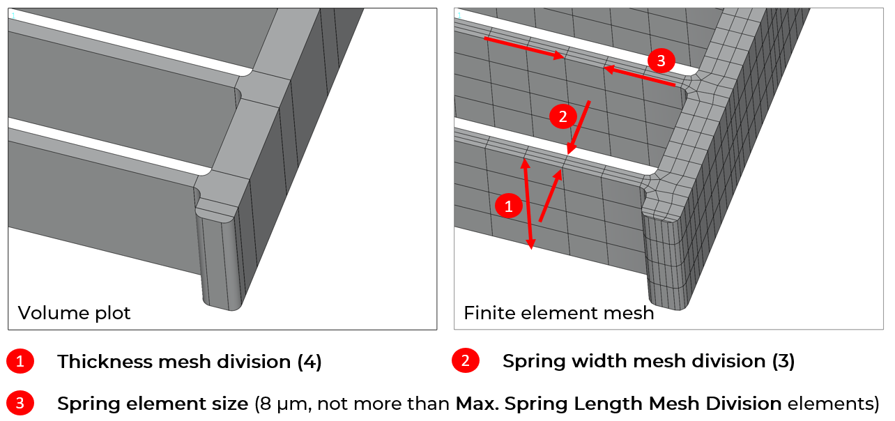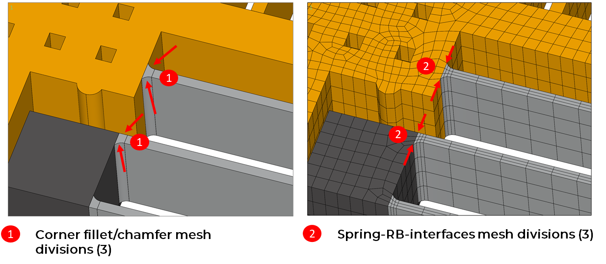 - The spring-RB-interface mesh division can only be set for models with corner chamfer or corner fillets. In all other cases, the Spring Width Mesh Divisions will be used for the interface to guarantee hexahedral elements in suspension springs.